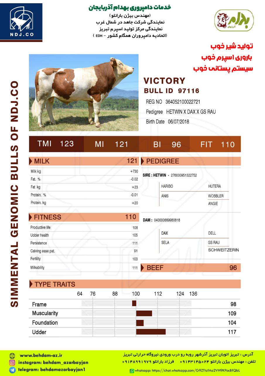 مشخصات اسپرم گاو VICTORY از نژاد سیمنتال کد (364052100022721) بهدام