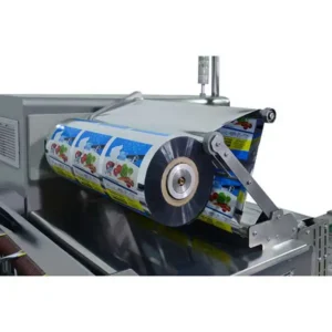 - سپس ظرفهای حاوی محصول به داخل قالب دستگاه هدایت شده و بستهبندی بصورت معمولی و یا با بهره گیری از روش MAP (بستهبندی به روش اتمسفر اصلاح شده) انجام میشود(در این قسمت فیلم بر روی ظرف دوخت میشود).