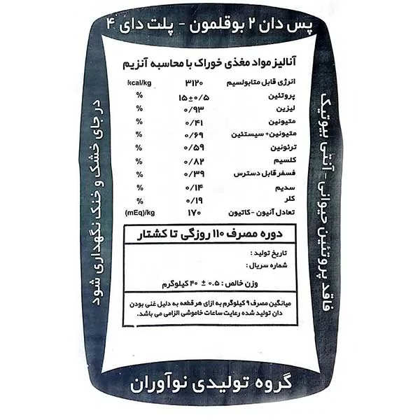 - دوره مصرف:110 روزگی تا کشتار